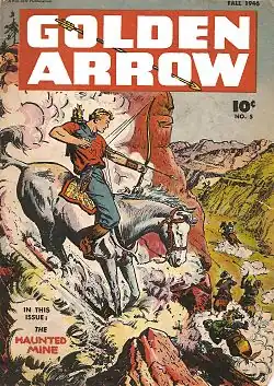 Golden Arrow was Roger Parsons who, as a young boy, went on a cross-country balloon trip with his parents. His father, Professor Paul Parsons, was testing out an invention that was supposed to revolutionize aviation, but he and his wife were both killed by their greedy rival Brand Braddock. Roger was found and raised by "Nugget Ned" and became the superhero Golden Archer when he grew up. He would coat his arrows in gold leaf and ride a horse named White Wind.[1][2] He would fight "angry natives, evil cowboys and outlaws, talking totem poles, the female shootist the Gun Ghost, the killer Desolation, and Butu, the Ancient Bow-Man."[3]