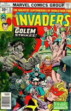 This character first appeared in Invaders #12 (January 1977) as Goldstein, and was created by Roy Thomas, Frank Robbins and Frank Springer; he appeared in Invaders #13 (February 1977) as Golem.
