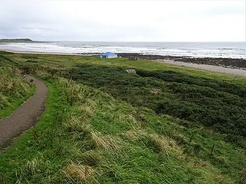 Golf Club House Halt railway station,[1] also known as Banff Golf House Halt railway station was opened in 1914.[1] The halt was located close to the town of Banff's golf club on the links. The line from Tillynaught opened in 1859 and a temporary terminus opened at Banff on 30 July 1859 and a permanent station opened in 1860.[3] There was a single platform at the Golf Club House Halt, located on the shore side of the line and no provision for goods traffic. The OS map of 1902 shows a 'Halt' at the site of the 1914 platform without indicating any structure at the site.[4]
