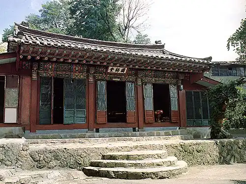 3. ^ Guksa-dang was removed to its current location at nearby Mount Inwangsan in 1925 when the Japanese colonial government built the State Shinto Chōsen Shrine on the peak.[36]