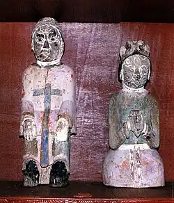 In the Okgwa version, the Goryeo princess Gongsim falls madly in love with Jo Tong, a twelfth-century man from Okgwa whose existence is historically attested. Jo Tong, who is married, decides that he must leave the capital to avoid the princess and volunteers to serve as a commander on Korea's northern frontier. One day, he is ambushed by enemy forces. He loses his left hand in the ensuing defeat. He resigns his command in shame and returns to Okgwa, where he dies of his injury. Meanwhile, Gongsim, who has been waiting for her love to return south, goes insane when he fails to come back. Her father sends her to Namsan, where she is cured of her madness by being initiated into shamanism. She rides a horse which goes where it will, intending to teach shamanism to the people wherever the horse may lead her. The horse stops at Okgwa, where she discovers Jo Tong's grave. She lives by his grave, spreading the shamanic religion among the locals. The locals hold a symbolic wedding for the souls of the two after her death.[6] As of the 1970s, Jo Tong and Gongsim were worshipped as village patron gods of Okgwa at the local Seonangdang shrine, where wooden statues of the two were installed.[7] Locals also identified a certain grave as belonging to the princess, and believed that her name was invoked by local shamans because it was she who had founded the shamanic religion of Jeolla Province.[8]