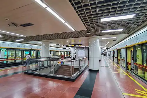 Due to being an interchange between two busy lines and serving a major office and shopping district, it's one of the busiest stations of the Guangzhou Metro. Both the line 1 and line 2 stations adopt the Spanish solution to separate boarding and alighting passengers on both lines. When the train arrives at the platform, train doors and platform screen doors on the right side are opened first to allow passengers to get off. Then those on the left side are opened to allow passengers to get on.