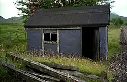 Platemen's bothy on east side of line at north end of platform, 26 August 1996. The dip in the skyline to the left of the bothy is the drovers' route to Glen Lyon.[17]