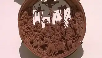 Prayer nuts often contain central scenes depicting episodes from the life of Mary or the Passion of Jesus.[63] Some are a single bead; more rare are those consisting of up to eleven beads, including the "Chatsworth Rosary" given by Henry VIII to Catherine of Aragon,[64] which is one of only two surviving boxwood rosaries.[65] The figures are often dressed in fashionable contemporary clothing. The level of detail extends to the soldier's shields, their jacket buttons, jewelry, and candles.[66] In some instances, they contain carved inscriptions usually related to the meaning of the narrative.[14][67] There are more modest examples, such as the two medallions making up the "Half of a Prayer Bead with the Lamentation" (MS 17.190.458a, b) in the MET, which shows the Virgin and Child alongside a kneeling nun holding a string of beads, and a Pietà. The two images are unusually simple for the type; only a small portion of the available surface of the borders contain inscriptions.[68]