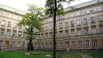 This monumental building was erected in 1870–1878 by architects Feliks Księżarski and Sylwester Hawryszkiewicz. During the First World War, it housed the headquarters of the 8th Russian Army.[1] In the interwar period, the Polish Voivodship Administration was located here, during the Nazi occupation—administration of the Governor of the Halychyna District. On April 28, 1943, the edifice witnessed an official ceremony of the inauguration of SS Division Galicia that was attended by representatives of the authorities, the National Socialist Party, the German army, former soldiers of the Ukrainian Galician Army, the press; well-known Ukrainian statesmen Viktor Kurmanovych and Volodymyr Kubiyovych were present too.[2]