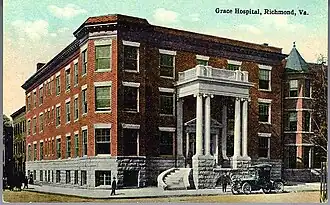 Grace Hospital is an American historic hospital in Richmond, Virginia. The original Colonial Revival structure was built in 1911 based on a design by noted Virginia architect Charles M. Robinson. The hospital is located to the west of Richmond's central business district and was substantially expanded by additions in 1930 and 1964. The original three-story main structure with an entrance pavilion on West Grace Street, is a Colonial Revival building with paired Ionic order columns and gauged arches. In 1930, a five-story Moderne style addition was built to the south along Monroe Street. In 1964, a further three-story addition was built along Grace Street. The 1964 addition is devoid of ornamentation, and the west wing "projects a modern, utilitarian character."[3]