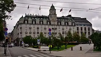 Grand Hotel is situated in a very central location on the main thoroughfare, the Karl Johans gate, between the Norwegian Parliament building and the Royal Palace. It is within walking distance to Oslo's main shopping and cultural areas, as well as its sights. The hotel was opened in 1874 and is one of the most traditional hotels in Norway.[1]