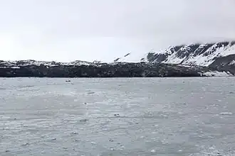 In 2004 Grand Pacific Glacier was about 2 miles (3,200 m) wide at the terminus, averaging about 150 feet (50 m) high at the ice face, up to 60 feet (20 m) deep at the waterline and over 35 miles (56 km) long. Much of the ice margin was then grounded at low tide; the calving section probably reached a water depth of only 30–60 feet (10–20 m). The ice cliff was estimated to be 60 feet (20 m) high where it was grounded, but about 150 feet (50 m) and up to 180 feet (55 m) high where it calved into Tarr Inlet. Behind the terminus, the ice may thicken to 900 feet (300 m) or more. The western two thirds of the ice in the terminus of the Grand Pacific Glacier originate from the tributary Ferris Glacier, and flowed about 1,500 feet (500 m) per year or about 4 feet (1 m) per day. This latter estimate was based on measurements of aerial photographs taken between 1988 and 1990 and may be higher than 2004 rates based on the fact that the ice had been thinning over the last 7 years or so. The eastern portion of Grand Pacific Glacier moved only about 150–180 feet (46–55 m) per year based on GPS measurements made by the Cold Regions Research and Engineering Laboratory (CRREL) in 1998–1999. It had advanced at a rate of about 60 feet (20 m) per year for the last several decades, but it reached a maximum position when it joined Margerie Glacier around 1992. In 2004 those glaciers were no longer together due to recession of the Grand Pacific margin. A small stream flowed between the two termini. The eastern edge was then receding at about 30–60 feet (10–20 m) per year and showed significant thinning and closure of crevasses. In about 1996, an embayment began to form in the center of Grand Pacific's terminus. Since then, the center of the ice cliff began to calve more rapidly and was slowly receding at perhaps 30 feet (10 m) or less per year. In 2004 the CRREL anticipated that retreat would accelerate as the embayment enlarged and the depth at the waterline increased. In such a scenario, retreat was likely to continue until the terminus reaches a position where it will become grounded above mean tide. The grounded western edge of the glacier was also slowing receding and thinning. Rock debris from landslides and medial moraines cover much of this side of the glacier and extends across almost two-thirds of the ice face. Where this rock debris is more than an inch thick, it insulates the ice, slows melting and results in a thicker ice mass than where the ice is clean. In many areas on the glacier, the debris is more than 3 feet (1 m) thick.[2]