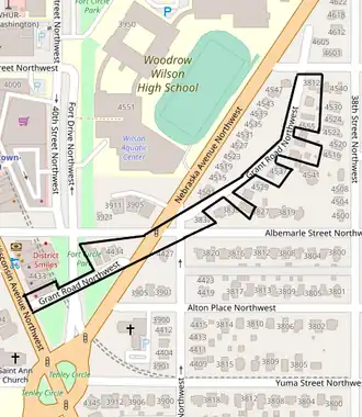 The Grant Road Historic District is located on the 4400 and 4500 blocks of Grant Road NW in the Tenleytown neighborhood of Washington, D.C. The 4400 block begins north of Tenley Circle at the intersection with Wisconsin Avenue, then crosses Fort Drive. Nebraska Avenue divides the two blocks. The 4500 block begins at the junction of 39th Street, Albemarle Street, and Grant Street, then proceeds northeast to the intersection with Brandywine Street. The historic district ends at this intersection, but this portion of Grant Road extends for another half block. Nebraska Avenue separates Grant Street from a one block portion further northeast between Cumberland and Davenport Streets.[2] There are two additional stretches of Grant Road further east: two blocks between 30th and 32nd Streets, and an unnumbered portion between Broad Branch Road and Ridge Road that passes through Rock Creek Park.[3]