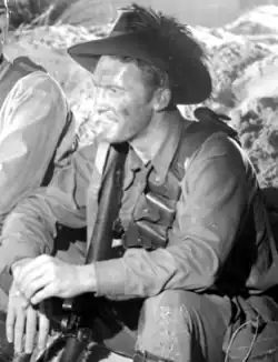 Taylor was then selected by Charles Chauvel to play the lead role of 'Red' Gallagher in the war film Forty Thousand Horsemen (1940). Chauvel had cast Errol Flynn in his first lead role. His wife Elsa described Taylor as like "a big kid" on the set.[9] Charles Chauvel said "I consider Grant Taylor by far the best screen lead here."[10] Taylor was paid £15 a week.[11]