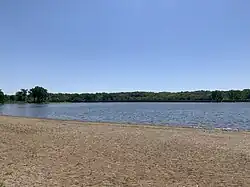 The park contains a sandy beach on the west side of the lake, a swing set, a boat rental stand, and two entrances to the park with their respective parking lots and restrooms.[3]
