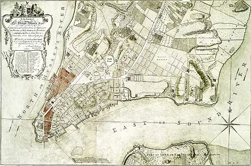 According to the eyewitness account of John Joseph Henry, an American prisoner aboard HMS Pearl, the fire began in the Fighting Cocks Tavern, near Whitehall Slip.[1] This being said, where the fire started is highly contested, whether the fires were scattered or started at the Trinity Church of New York. Abetted by dry weather and strong winds, the flames spread north and west, moving rapidly among tightly packed homes and businesses. The fast spread of the fire was also contributed to by the city's infrastructure with wooden buildings and narrow roads. Residents poured into the streets, clutching what possessions they could, and found refuge on the grassy town commons (today, City Hall Park). The fire crossed Broadway near Beaver Street and then burned most of the city between Broadway and the Hudson River.[18] The fire raged into the daylight hours and was stopped by changes in wind direction as much as by the actions of some of the citizenry and British marines sent in aid of the inhabitants.[1] It may also have been stopped by the relatively undeveloped property of King's College, located at the northern end of the fire-damaged area.[18][19] Estimates for the number of buildings destroyed range from 400 to 1,000, representing between 10 and 25 percent of the 4,000 city buildings in existence at the time.[1][2] Among the buildings destroyed was Trinity Church, the rebuilding of which became a symbol of resilience for New Yorkers; St. Paul's Chapel survived.[19]