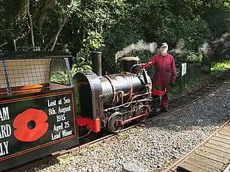 Following the periods of hand operation and then pony haulage, a pair of steam locomotives were delivered from Stephen Lewin of Poole in 1877. Ant and Bee were 0-4-0 tank locomotives made unusually narrow, in order to fit within the adit.[4] They were 4 ft 9 in (1.45 m) high and only 3 ft (0.91 m) wide. Their two 4 in × 6 in (102 mm × 152 mm) inside cylinders had Bagnall-Price valve gear and a geared drive to the rear axle, but coupling rods between the axles. The arrangement of the water tanks was particularly unusual, being a front tank ahead of the smokebox, in order to reduce width. They had launch-type boilers, as were commonly used for small locomotives with insufficient space between the frames for a conventional firebox.[4]