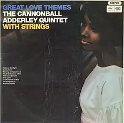 Great Love Themes is an album recorded in April 1966 by jazz saxophonist Julian Edwin "Cannonball" Adderley. It was released on the Capitol label featuring performances of ballads ― mostly Broadway show tunes ― by Cannonball Adderley with Nat Adderley, Joe Zawinul, Herbie Lewis, Roy McCurdy, and with string arrangements by Ray Ellis.[3][4] AllMusic awarded the album 1 star.[5] The album was produced by Tom Morgan, rather than Adderley's usual producer, David Axelrod. According to Adderley's biographer, Cary Ginell, "Although Cannonball loved to play show tunes, the lush, watered-down arrangements did not excite listeners, who had long since wearied of the jazz-artist-with-strings formula. Axelrod recalled that Cannonball hated the album and convinced Capitol to let him go back to working with Axelrod from then on."[6]