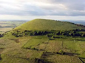 The summit is crowned by a low mound, marked as a tumulus on the Ordnance Survey 1:25,000 Explorer map.[3] This is probably a small Bronze Age burial mound. A small cairn has been built on top of it,[2] but was not there in the 1950s, when a dead tree trunk marked the spot.[6]