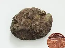Both Great and Little Mell Fells are unique among the fells of the Lake District by being composed of the Mell Fell Conglomerate, a sedimentary rock formed from deposits of sand and gravel in alluvial fans and braided river channels in a desert environment. The rock contains no fossils. The stones in the conglomerate came from the erosion of both the Borrowdale Volcanic Group and the Windermere Supergroup. The reddish-coloured rock appears to date from the late Devonian Period, sometime around 375 million years ago.[7] The erosion of this conglomerate has formed the smooth and rounded outlines that are distinctive of the two Mell Fells. While there are no crags on Great Mell Fell, boulders of the conglomerate may be seen in places, especially on the north slope, and it may also be seen in the two stream beds.
