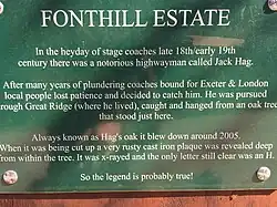 Legend has it that one highwayman, Jack Hag, lived in the Great Ridge and attacked these coaches. One day, local people pursued him into the wood, caught him and executed him by hanging him from an oak tree. The oak became known as 'Hag's Oak' and when the tree was blown down in a storm in 2005, an old "rusty cast iron plaque was revealed deep within the tree" after being cut up for timber. The only still clear letter was the letter 'H'.