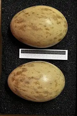 One to three olive or tan coloured, glossy eggs (two eggs being the average) are laid by the female in May or June. The nests, which are shallow scrapes made by the female on dry, soft slopes and plains, are usually situated close to the prior lek location. Nests are situated in sparse clusters, with a study in Inner Mongolia finding nests at a minimal 9 m (30 ft) apart from each other. In the same study, nests were placed at mid-elevation on a hill, at about 190 to 230 m (620 to 750 ft). Nesting sites are typically in dense grassy vegetation about 15 to 35 cm (5.9 to 13.8 in), likely for protection against predation, with extensive exposure to sunlight.[42] Eggs weigh about 150 g (5.3 oz) and are on average 79.4 mm (3.13 in) tall by 56.8 mm (2.24 in) wide. The female incubates the eggs alone for 21 to 28 days. The chicks almost immediately leave the nest after they hatch, although they do not move very far from their mother until they are at least 1 year old. Young great bustards begin developing their adult plumage at about 2 months, and begin to develop flying skills at the same time. They practice by stretching, running, flapping, and making small hops and jumps to get airborne. By three months they are able to fly reasonable distances. If threatened, the young stand still, using their downy plumage, mainly sepia in colour with paler buffy streaks, as camouflage. Juveniles are independent by their first winter, but normally stay with their mother until the next breeding season. Males usually start to mate from 5 to 6 years of age, although may engage in breeding display behaviour at a younger age. Females usually first breed at 2 to 3 years old.[3][41]