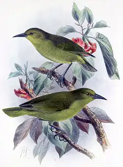 The greater ʻamakihi, also known as the green solitaire while it was extant, was the largest recent ʻamakihi. It was a brownish winged bird with a yellow body ending with a notched tail, and a whitish pointed beak. It was six inches long and it had blackish brown legs. (At least one naturalist of the era, however, noted, "The beautiful blue of the legs is retained in the skin for only a few days and then fades almost to black.")[2]