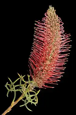 Grevillea paradoxa, commonly known as the bottlebrush grevillea,[2] is a species of flowering plant in the family Proteaceae and is endemic to the south-west of Western Australia. It is an erect to spreading, prickly shrub with pinnatipartite leaves, the lobes linear, widely spreading and sharply pointed, and with cylindrical clusters of pale to dark pink or cream-coloured flowers with a pinkish-red style.
