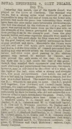 The club did not enter the FA Cup in this first season, but did so for the next three seasons; in 1879–80 the club reached the fourth round (which, that year, was made up of the last ten clubs), losing 1–0 to the Royal Engineers. The club was invited to play at Notts County in the aftermath of that match (possibly due to Ellis' family being Nottingham-based), and held the home side to a 3–3 draw, thanks mostly to the Friars' superior passing game.[7] Ellis was an umpire in the semi-finals that season, nominated by the Old Etonians.[8] In 1880–81 the club reached the same stage, this time a final 12, but lost the Old Etonians.