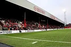 - Ealing Road Terrace – A single-tier terrace located at the Ealing Road end of the ground.[49] Previously uncovered, the club had an application to build a roof turned down in 2004 and the terrace finally received a roof in 2007.[13][59] Traditionally a home end, the terrace housed away supporters at various times throughout the 2000s.[60]
