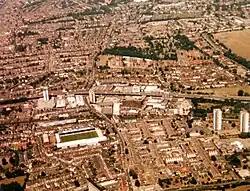 Little development occurred at Griffin Park between the mid-1930s and the mid-1980s and the ground's 38,000 capacity was the largest in its history.[6][10] The frontage of the Braemar Road stand was rebuilt in 1963, adding club offices and a club room.[11] Flats were built in a spare, matchday parking area behind the Ealing Road terrace in 1985 and the following year the Brook Road 'kop' was torn down and replaced by a two-tiered stand,[3] colloquially known as the 'Wendy House'.[12] On the New Road side of the ground, the 1930s extension to the terrace was removed and a sheet metal wall was added to the back of the stand.[3]