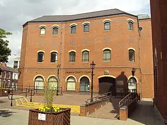 The new building was designed by the Property Services Agency in the Modernist style, built in red brick at a cost of £4.8 million,[6] and was completed in 1988.[7] The design involved an asymmetrical main frontage of seven bays facing onto Town Hall Square but well set back from the road. A large part of the building projected out to the east behind the Municipal Offices. The two bays on the left were canted forward and the end bays were canted back. The left hand end bay was blind on all floors. There was an opening, containing a glass doorway, in the second bay from the right, and, above the opening, there was a Royal coat of arms mounted on the brickwork. The other bays on the ground floor were fenestrated by round headed windows, while the first and second floors were fenestrated by segmental headed windows. The ground floor opening and the windows on all three floors were all surmounted by voussoirs formed by cream coloured bricks, and there were diamond shapes formed by dark coloured bricks between the first and second floors. Internally, the building was laid out to accommodate five courtrooms.[8]
