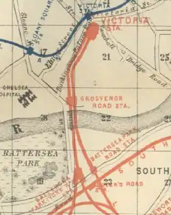 Grosvenor Road station was a railway station in London located at the north end of Grosvenor Bridge on the approach tracks to Victoria station. Victoria station was originally operated as two separate parts served by the London, Chatham and Dover Railway (LC&DR) and the London, Brighton and South Coast Railway (LB&SCR) and Grosvenor Road station was also operated in this way. The LC&DR station operated between 1867 and 1911 and the LB&SCR station operated between 1870 and 1907. The station building of the LC&DR station remains on the eastern side of the tracks adjacent to Grosvenor Road (A3212) although no platforms remain at the elevated track level.