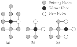 Node growth options in GSOM: (a) one new node, (b) two new nodes and (c) three new nodes.