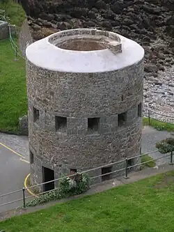 In 1778, General Henry Seymour Conway, Governor of Jersey, recommended that 30 towers (see Jersey Round Tower) be built there to impede a possible French incursion. As it happened, almost all the towers were built after the Battle of Jersey in 1781. However, in July 1778, the British government also authorized the building of 15 towers on Guernsey.[1] These towers were designed to accommodate only muskets (i.e., there was no provision for artillery); though there was discussion of giving each tower a Coehorn mortar for the roof platform, nothing came of this.[2]