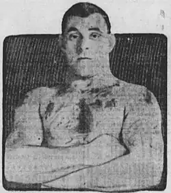 Moir's success led to commercial ventures such as the Gunner Moir boxing glove, and he appeared in a newspaper advertising campaign for Phosferine tonic, which continued for several years.[4][5] He also trained the wrestler George Hackenschmidt.[6] He successfully defended the title against Tiger Jack Smith, leading to a fight for Tommy Burns' world title on 2 December 1907 at the National Sporting Club — the first world heavyweight title fight to be held outside the US;[7][8][9] Burns retained his title in 10 rounds after knocking down the taller and heavier Moir twice in the first two rounds.[10][11] Burns subsequently claimed to have prolonged the fight in order to increase the value of the film rights to the fight, which he held.[12]