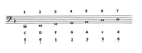 In early qin music theory, the word "diao" 〔調〕 meant both tuning and mode, but by the Qing period, "diao" meant tuning (of changing pitch) and "yin" 〔〕 meant mode (of changing scales). Often before a piece, the tablature names the tuning and then the mode using traditional Chinese names: gong》 (do), shang》 (re), jiao or jue》 (mi), zhi》 (sol), yu》 (la), or combinations thereof.[3] A more modern name for tunings uses the word jun〕 to mean key or pitch of the piece, so for example, zhonglü jun 〈仲吕均〉 means "F key", since zhonglü is the name of the Chinese pitch which Western equivalent is "F".