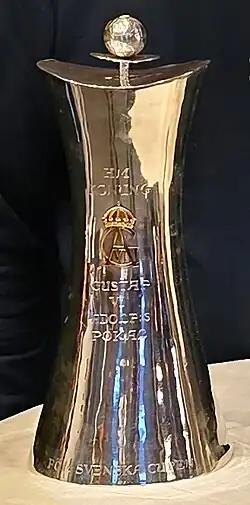 Gustaf VI Adolfs Pokal is a trophy awarded annually by the Swedish Football Association to the football club that wins Svenska Cupen, Sweden's premier football cup. The trophy was first introduced in 1967 to celebrate the reintroduction of Svenska Cupen after a break since 1953. The trophy was awarded until 1983 when Svenska Cupen was rebranded as Skandiacupen. Two different trophies were used between 1984 and 2001, Skandiacupen and SvFFs Pokal. Gustaf VI Adolfs Pokal was reintroduced as the cup trophy in 2002 and has been awarded annually since then.[1] The first club to lift the trophy was Malmö FF in 1967 and are the current holders having won the Svenska Cupen in 2022 over Hammarby the winners in 2021. IFK Göteborg is the clubs to lift the trophy the most times, having lifted it seven times.