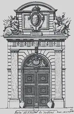 In 1601, after a series of disputes over the debts accumulated by Catherine de Medici, the heirs of the Queen yielded the hôtel to Catherine de Bourbon (1559-1604), sister of Henry IV of France (1553–1610). Many improvements were made to the hôtel over time, including a beautiful high portal in 1611 by Salomon de Brosse. On her death it was acquired by Charles, Count of Soissons, who gave it its name. He repaired and enlarged it, and it took the name of Hôtel de Soissons.[6] He died in 1612 and his widow, Anne de Montafié, Countess of Clermont-en-Beauvaisis, continued acquiring numerous properties around the hotel until her death in 1644. The Hôtel de Soissons was then in its final form. It passed to her daughter, Marie de Bourbon (1606–1692), wife of Thomas Francis, Prince of Carignano (1596–1656). Their son Emmanuel Philibert, Prince of Carignano (1628–1709), inherited the property, and passed it to his successor Victor Amadeus I, Prince of Carignano (1690–1741), in 1718.