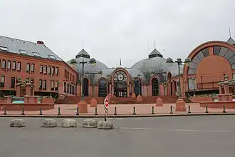 The complex was laid out in the shape of four octagons connected by a central block. The design involved an asymmetrical main frontage, arranged around a small courtyard, facing onto Avenue Youri-Gagarine. The left hand forward octagon featured a canted front fenestrated by a series of small segmented windows on two floors, while the right hand forward octagon featured a huge arch containing a semi-circular brick panel surrounded by glass voussoirs. The central section featured five round headed openings: the middle opening, which was larger than the others, contained a glass door with a clock above, while the other openings contained leaded glass. The four octagons were surmounted by zinc domes. Internally, the principal rooms included a long entrance hall, which connected the four octagons and featured eight stained glass murals, created by the painter, Valerio Adami, and manufactured by the glassmaker, Jacques Loire.[7] They also included the Salle du Conseil (council chamber), which featured a mural by Jean-Pierre Yvaral depicting Marianne, and the Salle des Mariages (wedding hall), which featured a mural by Ernest Pignon-Ernest depicting two hands clasped together.[8][9][10]