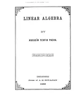 Hüseyin Tevfik Pasha (1832 in Vidin, Ottoman Empire (now in Bulgaria) – 16 June 1901 in Constantinople (now Istanbul)) was a mathematician from the Ottoman Empire[1] and military adjutant representing the Ottoman Empire in the purchase of foreign rifles. He is remembered for his Linear Algebra (1882, 1892) which outlined some vector algebra including a "special perpendicular" (cross product) and properties of curves. The book title was precocious since the early vector algebra was generalized in vector space, and this concept later produced linear algebra. He is known as Tawfiq Pasha of Vidin or as Vidinli Huseyin, Tawfiq Pasha in Turkish literature.[2] He served as Envoy of the Ottoman Empire to the United States.