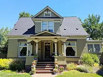 The H.E. McElroy House in Boise, Idaho, USA, was designed by John E. Tourtellotte and constructed in 1901 in a neighborhood now designated the Fort Street Historic District. The brick veneer, 1+12-story Colonial design features a rectangular, symmetrical facade with a ridgebeam parallel to the street and an entry porch supported by Doric columns above flared, shingled walls. Dormers and gables are covered with square-cut and fish-scale shingles.[2]