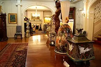 Over 60 paintings by Indiana's most important historic artists are on permanent display at all times, as well as works by Indiana's most important historic and contemporary ceramic artists. The mansion is furnished in important large scale American antiques focusing on the period 1860 to 1890. A superior grade Wooton desk and massive Thomas Brooks pier mirror are just two of the outstanding pieces of furniture. A Swiss made cylindrical music box featuring drums, bells, castanets, organ and flute sections is one of the highlights of the museum. The Weller Pottery Company had five monumental vases at the St. Louis World's Fair, and the Haan Museum has the three largest, including the seven foot tall Weller vase that won a Gold Medal for the Arts at the Fair.