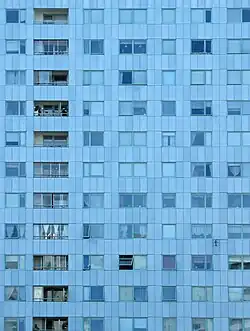 It has eight large light-blue residential buildings that consist of 13 floors and an extra roof floor. The houses can be seen from Kaknästornet.
