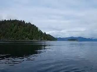 Haida Gwaii (/ˈhdə ˈɡw/;[2] Haida: X̱aaydag̱a Gwaay.yaay / X̱aayda gwaay, literally "Islands of the Haida people"),[3] previously known as the Queen Charlotte Islands, is an archipelago located between 55–125 km (34–78 mi) off the northern Pacific coast in the Canadian province of British Columbia. The islands are separated from the mainland to the east by the shallow Hecate Strait.[4] Queen Charlotte Sound lies to the south, with Vancouver Island beyond. To the north, the disputed Dixon Entrance separates Haida Gwaii from the Alexander Archipelago in the U.S. state of Alaska.