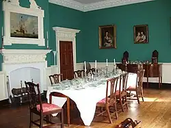 The interior presents the appearance of symmetry where it is in fact not symmetrical, using false doors where necessary to maintain the illusion. The main rooms are the first-floor dining room and the second-floor ballroom immediately above, at the rear of the house overlooking the garden. The dining room features an opening, centered in the facade, that is treated as a door on the outside and as a window on the inside.[4]