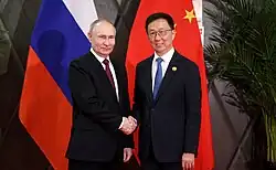 In May 2024, Han met with Russian president Vladimir Putin in Harbin, where both Han and Putin attended the opening ceremony of 8th China-Russia expo.[18] On 10 October, he succeeded Wang Qishan as the honorary president of the Red Cross Society of China.[19] He attended the second inauguration of Donald Trump on 20 January 2025 as President Xi's special representative.[20] Han's attendance marks the first time a senior official of China's government has been sent to a US presidential inauguration.[21] Han's presence at the event, as he is a trusted senior official, was seen by commentators as representative of Xi's interest in strengthening China–United States relations.[14][22] Han attended separate meetings with incoming US vice president JD Vance and Trump ally Elon Musk before the inauguration, where Han and each of the two reaffirmed this directive to promote agreement and stable relations between their respective countries.[23]