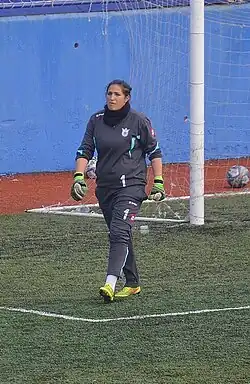 From 19 October 2012 she was the substitute goalkeeper at the Izmir-based Konak Belediyespor,[2] where she enjoyed twice consecutive league champion titles.[1] She spent the games of the 2013–14 UEFA Champions League on the bench. She appeared in two of the three matches of the 2014–15 UEFA Women's Champions League qualifying matches.[3][4] She appeared twice at the 2015–16 UEFA Women's Champions League qualifying round.[5][6]