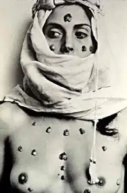 In 1974, Wilke began work on her photographic body art piece S.O.S — Starification Object Series, in which she merged her minimalist sculpture and her own body by creating tiny vulval sculptures out of chewing gum and sticking them to herself.[15] She then had herself photographed in various pin-up poses, providing a juxtaposition of glamour and something resembling tribal scarification.[15] Wilke has related the scarring on her body to an awareness of the Holocaust. These poses exaggerate and satirize American cultural values of feminine beauty and fashion and also hint at an interest in ceremonial scarification.[21] The 50 self-portraits were originally created as a game, "S.O.S.Starificaion Object Series: An Adult Game of Mastication", 1974–75, which Wilke made into an installation that is now in the Centre Pompidou, Paris. She also performed this piece publicly in Paris in 1975, having audience members chew the gum for her before she sculpted them and placed them on papers that she hung on the wall.[21] Wilke also used colored chewing gum as a medium for individual sculptures, using multiple pieces of gum to create a complex layering representing the vulva.[22] Wilke's use of vaginas and vulvas refer to her idea of ″natural womanhood″, in order to support her argument that women are biologically superior.[18] Later on in 1976 she once again conjured the pin-up poses in her self-portrait, Marxism and Art: Beware of Fascist Feminism.