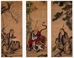 Hanshan (left), Fenggan (center), and Shide (right). Ueno Jakugen, 18th century, Japan