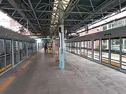 Hanyang University at Ansan station (Korean: 한대앞역) is a station on Seoul Subway Line 4 & the Suin–Bundang Line in Ansan-si, Gyeonggi-do, South Korea.[1] It is named after the city's ERICA campus of Hanyang University.[1] Unlike the name of the station, Hanyang University is not right in front of the station. Hanyang University shuttle buses stop in front of the station.[2] Buses usually take students from the station to the university every 10 minutes on weekdays and every 30 minutes on weekends.[3] The bus operation time can be checked on the app called 휴아봇. It takes about 10 minutes from the station to the ERICA campus.[4]