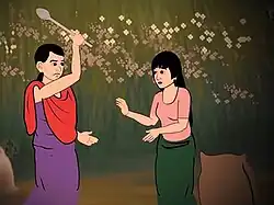After Haosi Namoinu's mother's untimely death, her father remarried with Nganurol Laoshigam Chanu (Loisingam Chanu), the sister of her mother. Spending a few days happily, Senbi Loikenba left for Kabo on the King's errand and during his absence, Haosi Namoinu was harshly treated by her stepmother.[4][5] She was not allowed to go outside and play with her friends. She had to work as hard as she could to satisfy her stepmother. Her bliss of household life was much worsened. Her stepmother ordered her work after work and she completed it with no rest. She was forced to husk the rice, tired as she was, again she had to cook food for them and serve but she uttered no lamentation. Her stepmother's ruthlessness came to the highest degree and she ordered Haosi Namoinu, that if she wanted to join the feast (spring festival), she had to go to the maternal grandparents' house and bring a load of paddy rice (un-husked rice). She did so, but her stepmother was still not satisfied, and struck her head with a cookery utensil. Having been deprived of all youthful delights, the girl transformed herself into a Hari Nongnang (cicada) (or cricket in some version), with her clothes as wings and feathers, and flew away with ravishing tears.[6][3]