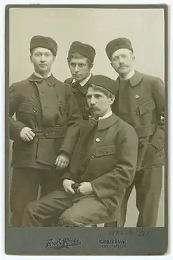 Four participants from the 1902–1904 Literary Greenland Expedition (Harald Moltke, Ludvig Mylius-Erichsen, Knud Rasmussen, and Alfred Bertelsen), photographed by Frederik Riise. Moltke is on the far left.