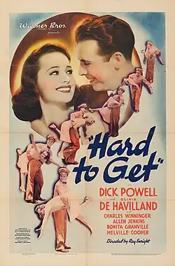 Hard to Get is a 1938 American romantic comedy film starring Dick Powell and Olivia de Havilland.[1] Written by Jerry Wald, Maurice Leo, and Richard Macaulay, and directed by Ray Enright, the film is about a spoiled young heiress who tries to charge some gasoline at an auto court and is forced by the attendant to work out her bill by making beds and cleaning rooms. Resolving to get even, she pretends to have forgiven him, and then sends him to her father to get financing for his plan to develop a string of auto courts across the country, knowing he will only be wasting his time.